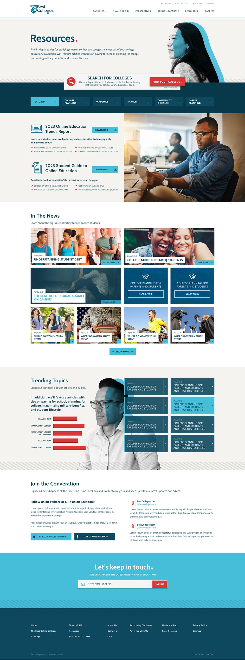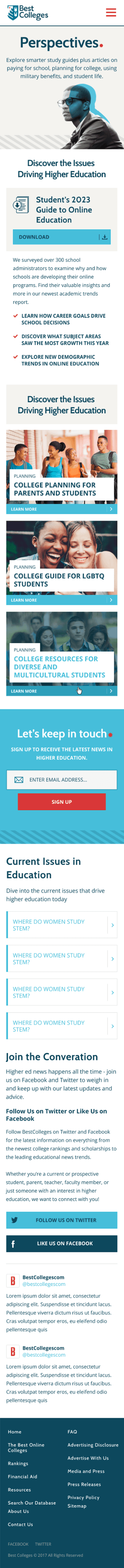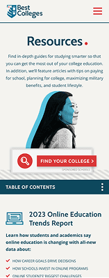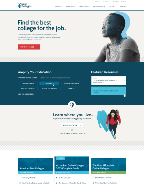 Redefine the BestColleges.com user experience and visual branding to position it as the go-to authority for college rankings, guidance, and decision-making. A full UX audit uncovered fragmented systems, which were streamlined into a unified design framework and presented to leadership, securing buy-in and budget to perform the refresh. Two core personas were also identified & developed: EDUs (Marketers, Academics, Administrators) and